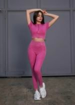 Meta Short Sleeve Zip Crop Top In Pink
